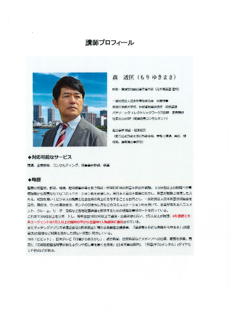 講師:森 透匡 氏 ((一社)日本刑事技術協会 代表理事)