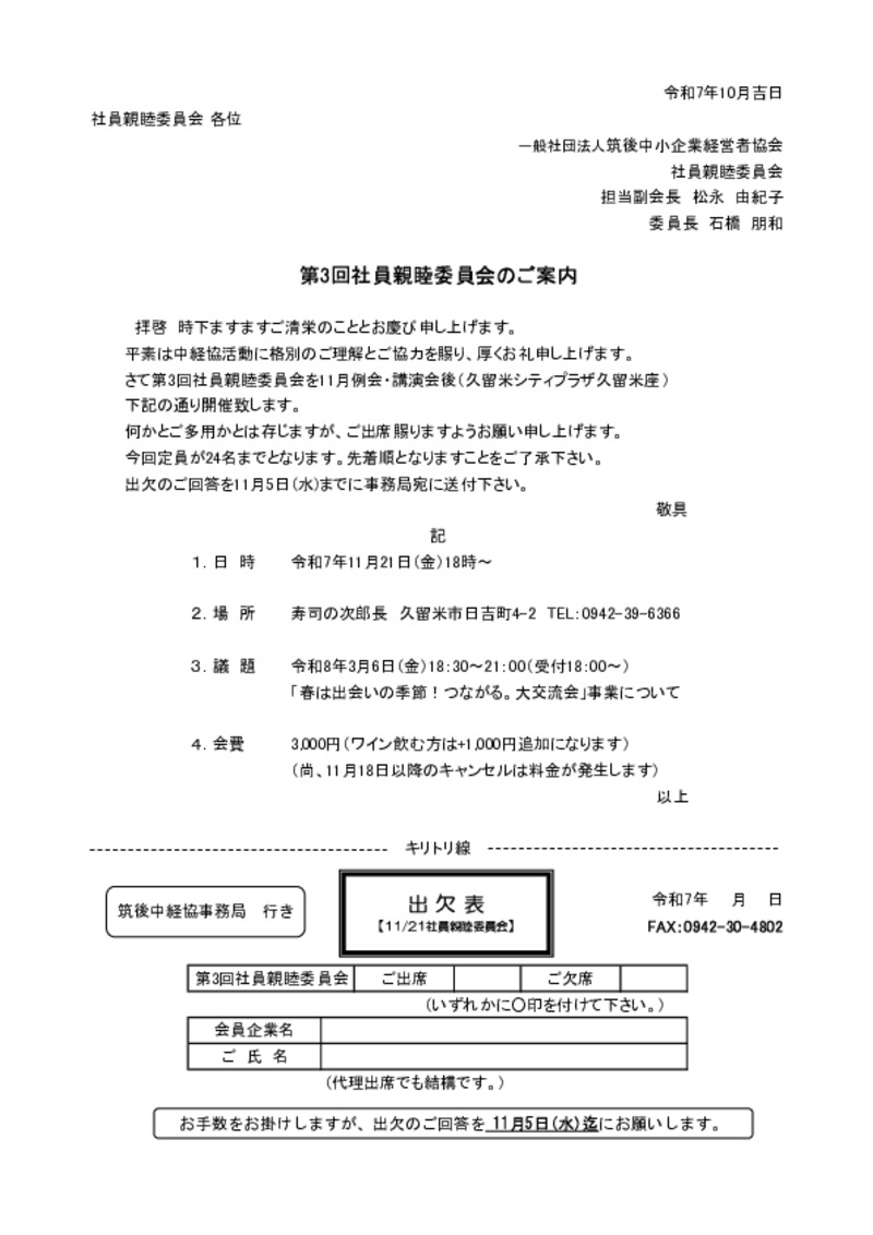 - 寿司「次郎長」にて開催し、委員長の持ち出しによるワインを提供。さらにビール、ハイボール、日本酒、焼酎と幅広いお酒を取り揃え、参加者が自由に楽しめるようにする。ノンアルコール飲料も用意し、お酒を飲まれない方にも配慮した場とすることで、幅広い層が心地よく親睦を深められる会食の場とする。