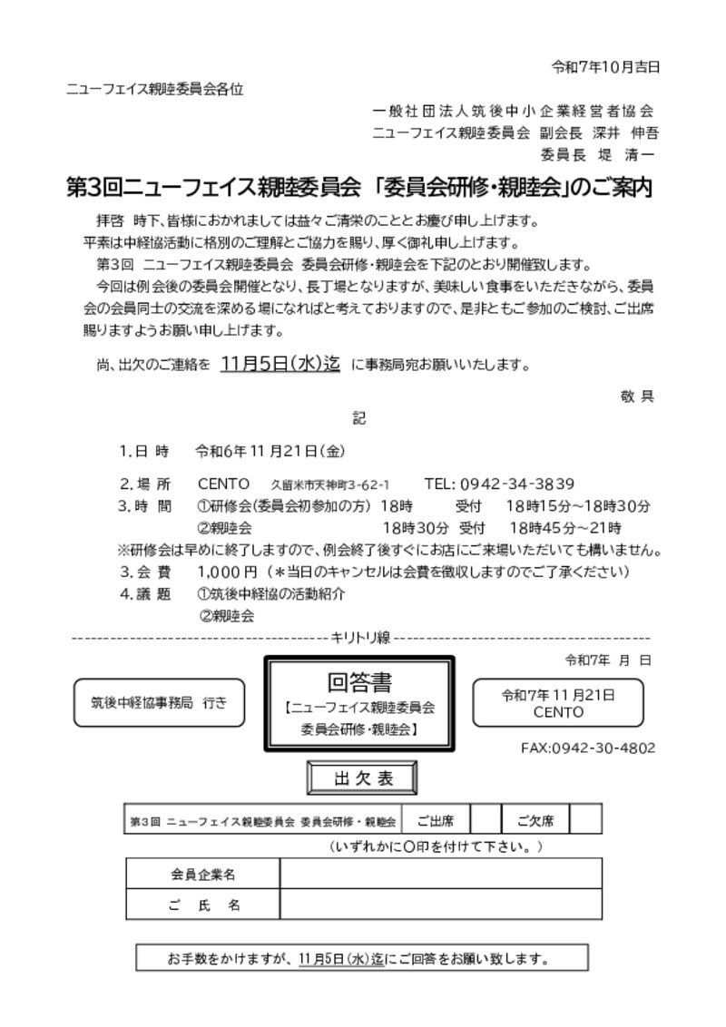 - 久留米シティプラザでの11月例会講演会終了後に委員会研修会、親睦会を開催する。