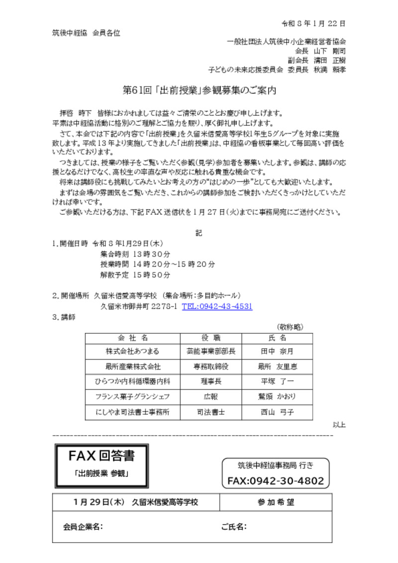 - 筑後中経協の看板事業である「出前授業」を久留米信愛高等学校1年生5グループを対象に実施致します。