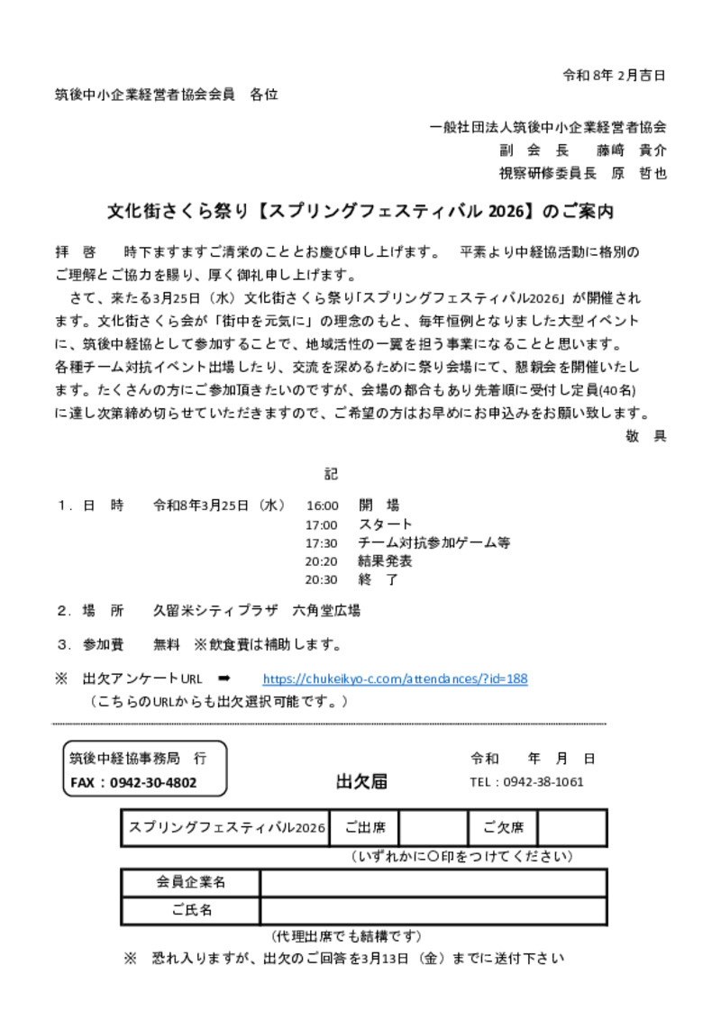 - 来たる3月25日(水)文化街さくら祭り「スプリングフェスティバル2026」が開催されます。文化街さくら会が「街中を元気に」の理念のもと、毎年恒例となりました大型イベントに、筑後中経協として参加することで、地域活性の一翼を担う事業になることと思います。